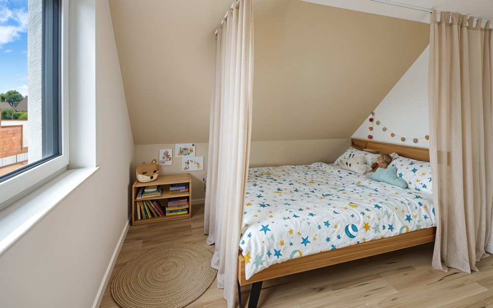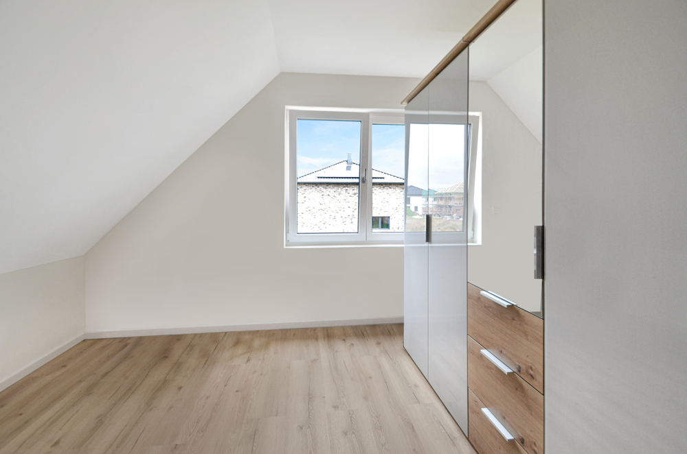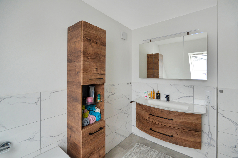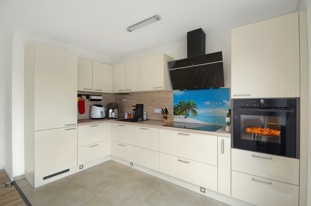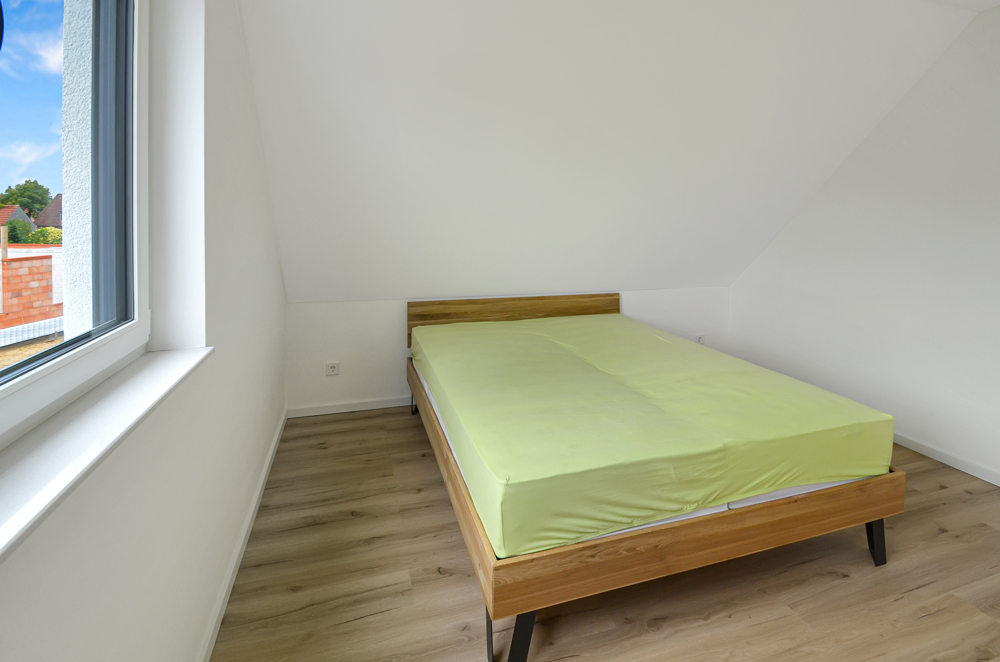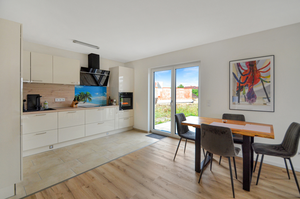 Die sinnvolle Erdgeschossgestaltung mit großzügigen Fensterfronten im Wohn-, Ess-, und Küchenbereich schenkt dem Zuhause eine freundliche Leichtigkeit und lädt dazu ein Familienmomente zu genießen. Eine geräumige Diele, das Gäste-WC, Abstellfläche für Haushaltsgeräte, sowie ein vielseitig nutzbarer Raum z. B. Home-Office (Glasfaser vorhanden) oder Gästezimmer, ergänzen das Raumangebot – ideal für das Familienleben. Im Obergeschoss, welches Sie über die edle Treppe mit Stufenbeleuchtung erreichen, stehen Ihnen als Rückzugsort drei weitere Zimmer, die flexibel als Schlaf-, Kinderzimmer oder Ankleide genutzt werden können, zur Verfügung. Das schick gestaltete Badezimmer rundet die Etage harmonisch ab. Weitere Abstellflächen hält der Dachboden vor. Verzichten müssen Sie hier auf NICHTS! Bei der Ausstattung ist an alles gedacht. Geheizt wird Ihr modernes Zuhause mit einer Wärmepumpe und selbstverständlich Fußbodenheizung. Eine Lüftungsanlage ist installiert. Alle Fenster verfügen über elektrische Rollläden, das gesamte Elektrikpaket ist umfangreich. Voll-, und Duschbad sind mit hochwertigen Möbeln, schicken Duschkabinen und besonderen Dusch-WC’s ausgestattet. Geschmackvolle Fliesen und Vinylboden sind in den Räumen verlegt. Die edle Häcker-Küche überzeugt nicht nur mit ihrem modernen Look und den Markengeräten, sie ist auch ein echtes Raumwunder mit ihren vielen Auszügen. Vergessen die Spülmaschine anzustellen und schon zur Arbeit? Kein Problem – Ihr Neff-Gerät bedienen Sie bequem per App, auch von unterwegs und wer bei Ihnen vor der Tür steht, sehen Sie bereits auf der Kamera in der Stube.