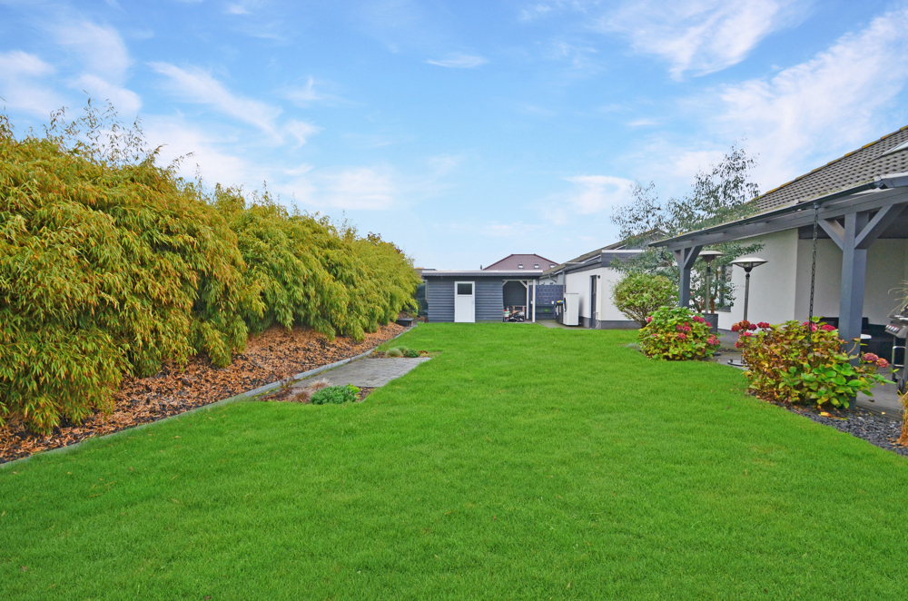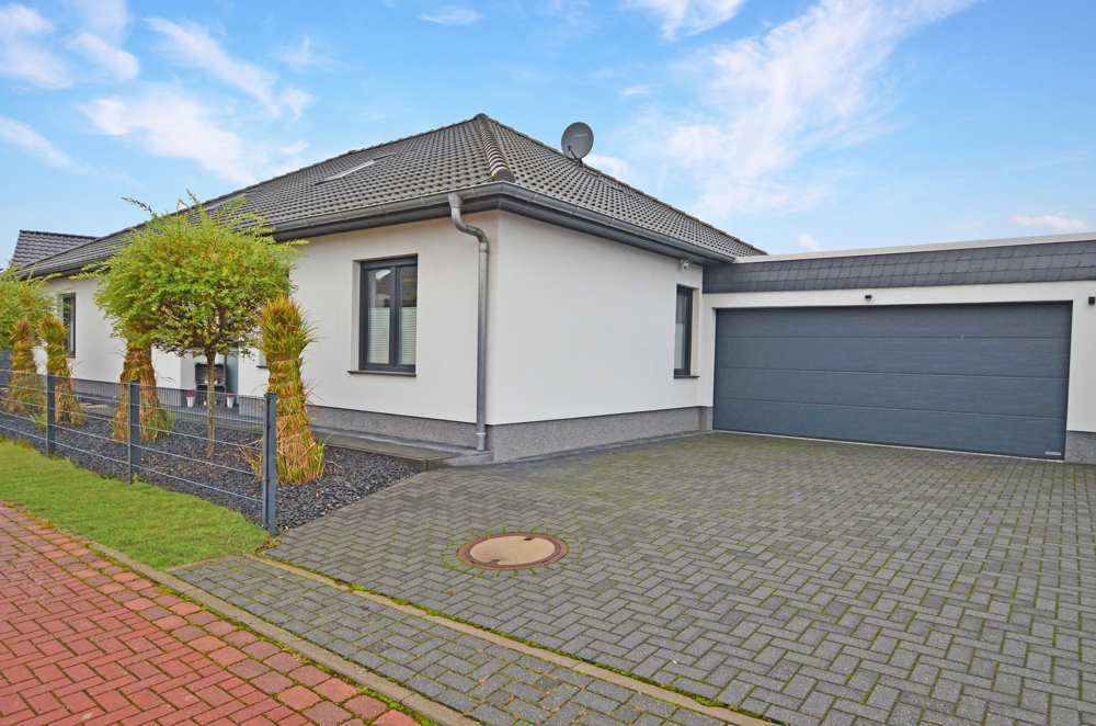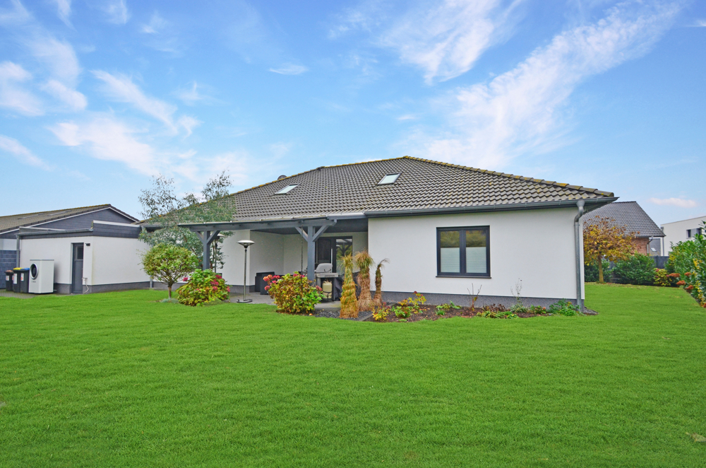 Konzipiert zum Leben – in ihm wohnen ist einfach großartig. Der in Massivbauweise erstellte, moderne Bungalow ist ein echtes Multitalent. Ob Familien mit Kindern, Paare mit Home-Office und Hobbies oder Best-Ager – für alle-(s) ist gesorgt. Im Erdgeschoss wird großzügig auf ca. 150 m² mit fünf Zimmern gewohnt. Sinnvolle Raumkonzepte stehen im Einklang mit ausgewählten, hochwertigen Materialien. So heißt Sie ein geräumiges Entrée mit Zugang zum Gäste-WC und Büro (Glasfaser vorhanden) willkommen. Der Hauswirtschaftsraum punktet nicht nur mit seinen ca. 14 m², sondern auch mit direktem Zugang zur Doppelgarage, selbstverständlich mit Sektionaltor und einem praktischen Geräteraum, perfekt zum Einrichten Ihrer Werkstatt oder der eigenen Sauna. Mit wahrer Größe verschmelzen Wohnen, Essen und Kochen zu einem harmonischen Ganzen von ca. 43 m². Eine schicke, hochwertige Einbauküche haben die Mieter eingebaut. Sie kann bei Bedarf von ihnen übernommen werden. Ums Eck finden Sie in drei weiteren Zimmern Ihre persönlichen Rückzugsorte und das stattliche Familienbad mit Badewanne und Dusche. Eigentlich wäre, wie üblich bei Bungalows, jetzt alles über die Innenräume erzählt – nicht aber bei diesem besonderem Schmuckstück. Im Dachgeschoss (Stahlbetondecke verbaut) wartet ein exklusives Studio auf Ihre Wohnideen. Jetzt wird es als Sport-, und Wellnessbereich mit Sauna und Dusche genutzt. Es bietet aber ebenso Potential für den Ausbau zweier weiterer Räume mit Duschbad. Was sind Ihre Wünsche? Bei der Umsetzung unterstützt Sie der Eigentümer gern. Modern und alltagstauglich ist der Außenbereich gestaltet. Hecken und Gräser rahmen das Grün geschmackvoll ein und bieten Privatsphäre. Auf der überdachten Terrasse macht auch das Wintergrillen noch Freude. Spielgeräte für die Kinder oder Ihre zukünftigen Hochbeete finden hier noch problemlos ihren Platz, ebenso das Gartenhaus.