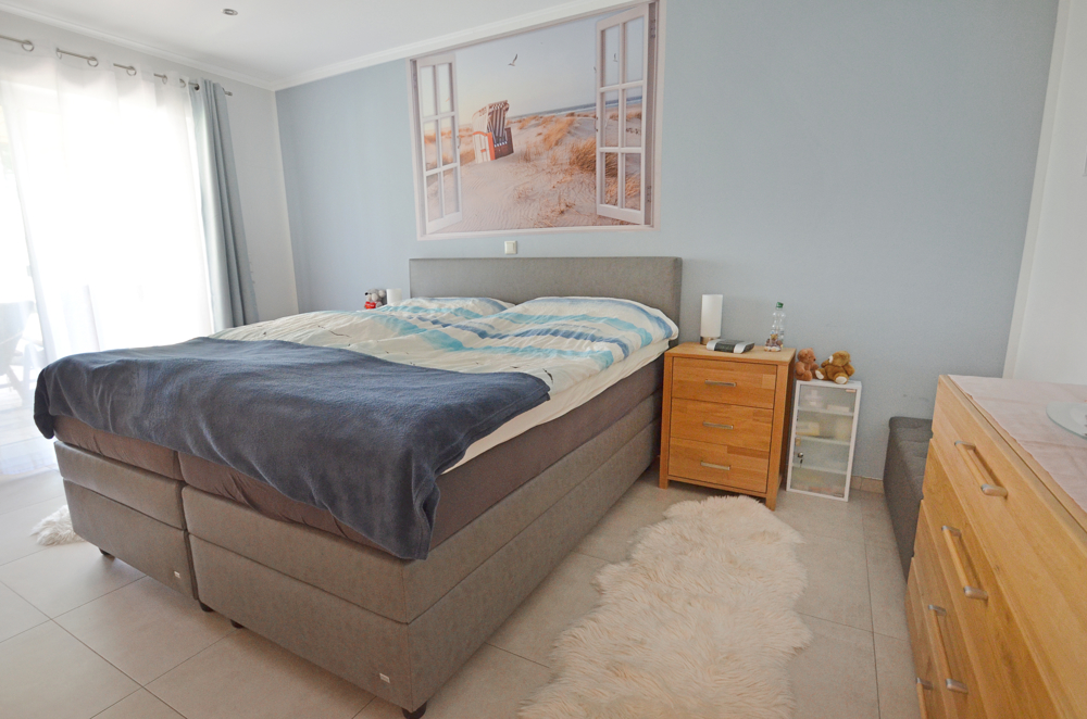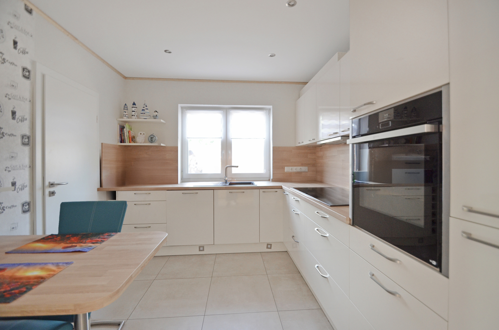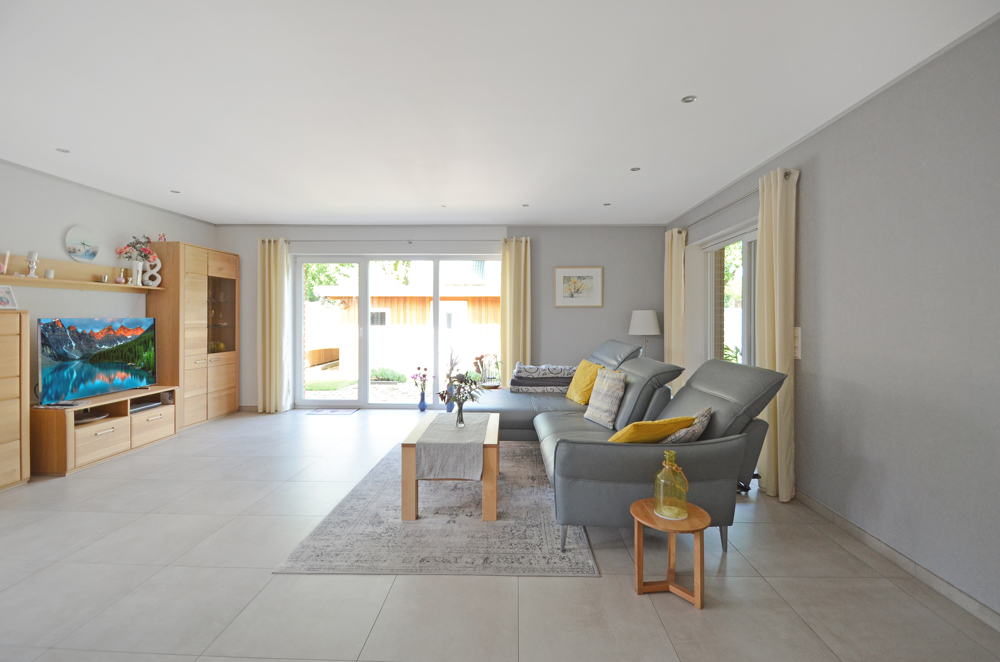 Geheizt wird mit moderner Gas-Brennwerttechnik in Kombination mit Solarmodulen zur Warmwasserbereitung, natürlich ist im ganzen Haus eine Fußbodenheizung verlegt, auch in der Dusche gibt`s warme Füße. Die gute Isolierung gewährleistet niedrigste Energiekosten (ca. 4400 kWh Gas/Jahr, monatliche Heizkosten ca. 55,- €). Elektrische Rollläden sind selbstverständlich, die eingebauten Fliegengitter ein zusätzliches Plus. Für die ganz warme Jahreszeit ist im Schlafzimmer und Büro/Wohnzimmer eine Klimaanlage verbaut. Großformatige, schicke Fliesen sind durchgängig verlegt. Sie sind sehr pflegeleicht, besonders wenn Sie Kinder oder Haustiere haben bzw. Allergiker sind. Die wertigen Hensel-Innentüren zeichnen sich durch eine klare, moderne Optik aus. Überwiegend sind sie einen Meter breit, ideal wenn Sie auf eine Gehhilfe oder Rolli angewiesen sind. Die edle Badausstattung mit bodentiefer Dusche, eleganter Badewanne und modernen Schränken werden Sie mögen und die höher angebrachten Toiletten nicht nur im Alter schätzen.