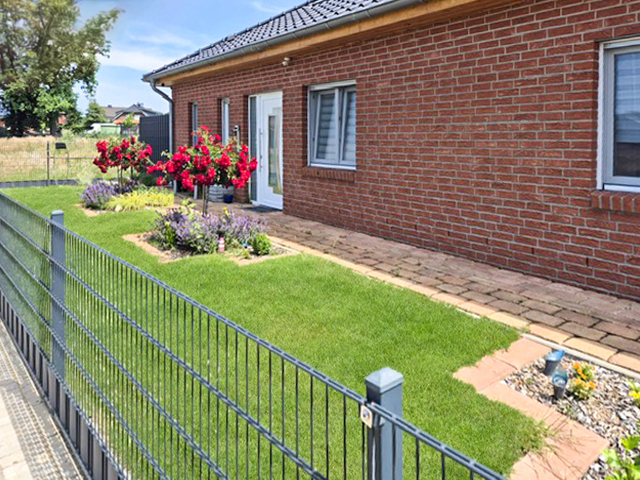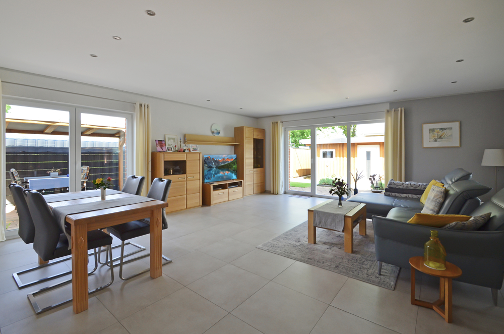 • Willkommen in diesem wunderschönen Klinker-Bungalow, der durch seine moderne Ausstattung und durchdachte Raumaufteilung besticht. Das Haus ist barrierefrei gestaltet und bietet somit komfortables Wohnen für alle Generationen und Menschen mit Handicap. Hier fehlt es an NICHTS! In der modernen Küche mit vielen Abstell-, und Arbeitsflächen findet auch noch der Frühstückstisch bequem Platz. Den sich anschließenden Vorratsraum werden Sie besonders schätzen. Die gute Stube mit Zugang zur überdachten Terrasse, ist lichtdurchflutet und zeigt mit ca. 41 m² wahre Größe. Für behagliche Stunden sorgt ein Kaminofen. Das Büro, alternativ ein Gäste-, bzw. Kinderzimmer, schließt sich dort an. Über den schicken Flur betreten Sie das gemütliche Schlafzimmer, ebenfalls mit Zutritt zur Terrasse und angemessener Fläche für Ihre Kleiderschränke. Im Bad ist an alles gedacht – ganz gleich, ob Sie gern duschen oder in der Badewanne entspannen möchten. Das Gäste-WC bietet zusätzlichen Komfort für Ihre Besucher. Endlich einen Hauswirtschaftsraum mit ansprechenden Maßen – viel Platz für Stauraum und Hausarbeit, das erleichtert den Alltag. Potential für individuelle Erweiterungen steht als Ausbaureserve im Dachgeschoss bereit. Alternativ können Sie die Küche in die ca. 41 m² große Stube verlegen und haben so einen weiteren Schlafraum mit kleiner Ankleide. -„Unbezahlbar“ ist die Doppelgarage mit direktem Zugang zum Haus. Dessen Zufahrt bietet zudem noch zwei weitere Außenstellplätze. Ein wahres Gartenparadies ist schon für Sie angelegt, schöne Beete, gemütliche Plätzchen zum Entspannen und Grillen, ein massives Gartenhaus und vieles mehr gibt es zu entdecken. Die überdachte ca. 26 m² Hauptterrasse lässt sich fast ganzjährig nutzen und mit der Rundumbeleuchtung wird’s in den Abendstunden richtig kuschelig.