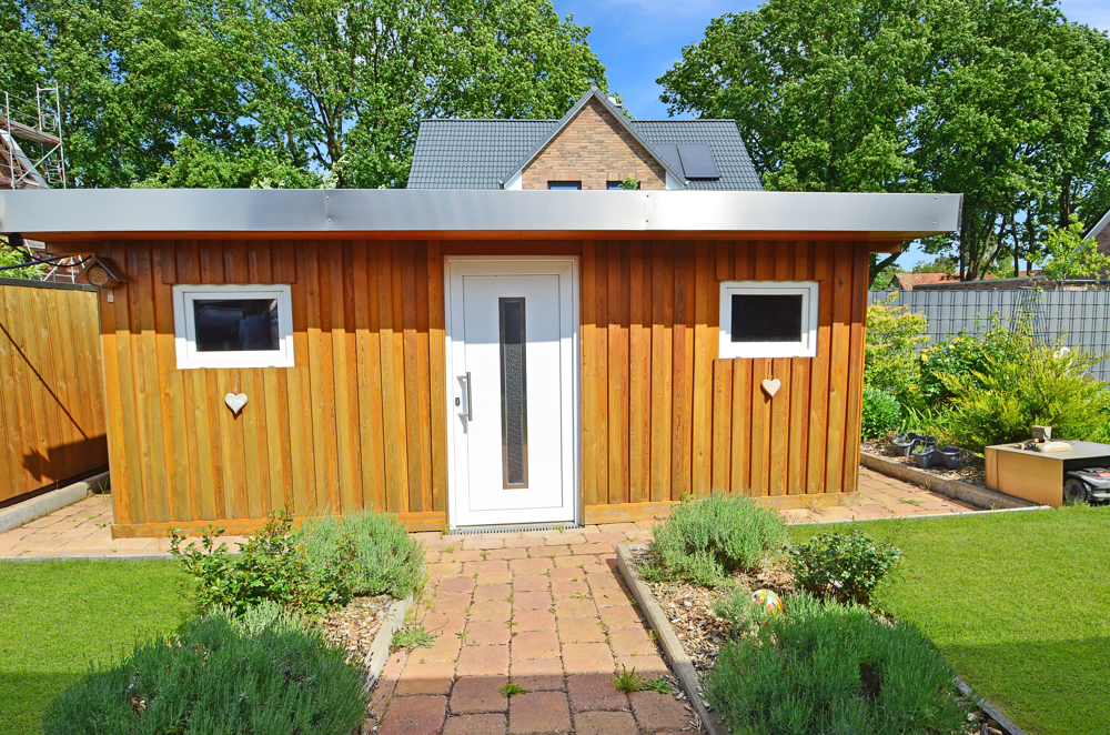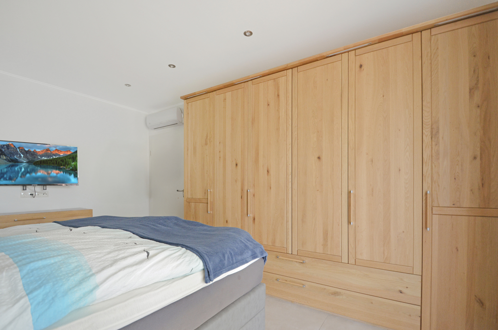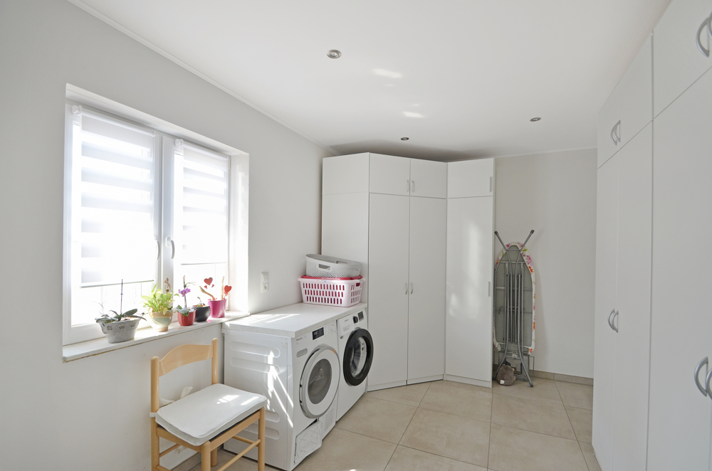 LED-Strahler finden Sie im ganzen Haus, sie beleuchten auch den kompletten Außenbereich des Hauses. Das ist schick und energiesparend zugleich. Ihre Türklingel ist mit einer Sprechanlage und Bildschirm gekoppelt, so erkennen Sie immer gleich wer Sie besucht. Glasfaser liegt im Haus, Fern können Sie alternativ auch über die installierte Schüssel sehen. Ein Gartenbrunnen und der Mähroboter helfen bei der Gartenarbeit. Arbeitsgeräte finden ihren Platz in der massiven Gartenhütte aus Lärchenholz. Für das Holz gibt es Unterstände und falls gewünscht, lassen sich in der großen Garage nicht nur die E-Autos parken und aufladen, sondern auch eine kleine Werkstatt einrichten. Der Einbau des zweiten Sektionaltors zum Garten ist ein echter Gewinn.